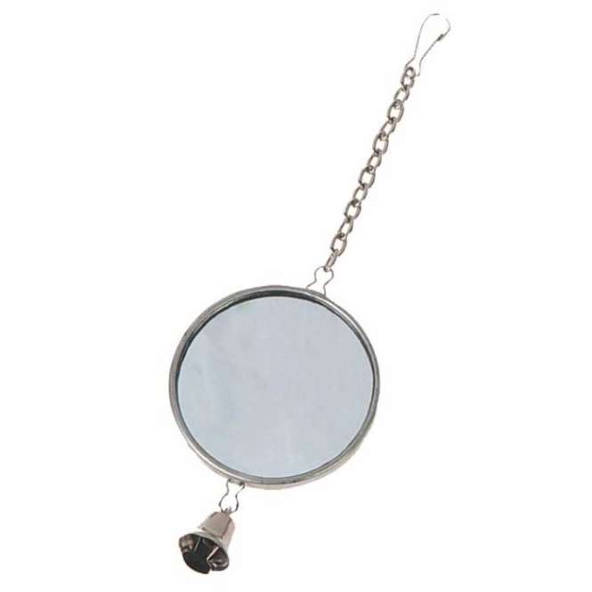 Runder Metallspiegel für Vögel zum Befestigen im Käfiggitter. Mit Glöckchen.