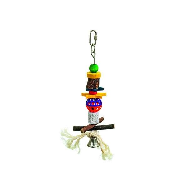 Vogelgerechter Materialmix aus Naturholz, Lavastein und Baumwolle mit Glöckchen.