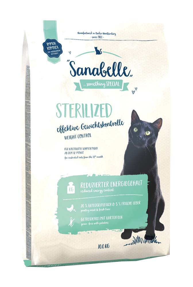 Sanabelle Sterilized ist eine ohne Zusatz von Getreide stark energiereduzierte Vollnahrung für ernährungssensible Katzen, die auf Grund einer Kastration zu Übergewicht neigen. Der erh&ouml-hte Gehalt an Ballaststoffen (Rohfaser) sorgt für eine gute Sättigung und eine schonende, nachhaltige Reduktion des Gewichtes (weight control). Dadurch werden Muskeln, Gelenke, Knochen und Kreislauf zusätzlich besser entlastet.