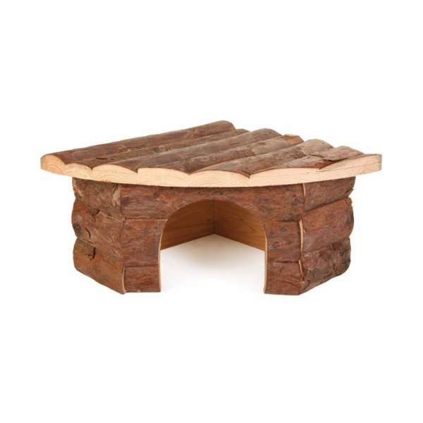 Das Eckhaus Jesper aus Naturholz kann in jedem Käfig Platz sparend aufgestellt werden. Das Flachdach bietet Platz zum Heraufspringen oder -klettern. Diese Größe eignet sich ideal für Meerschweinchen, Zwergkaninchen und ähnlich große Tiere.